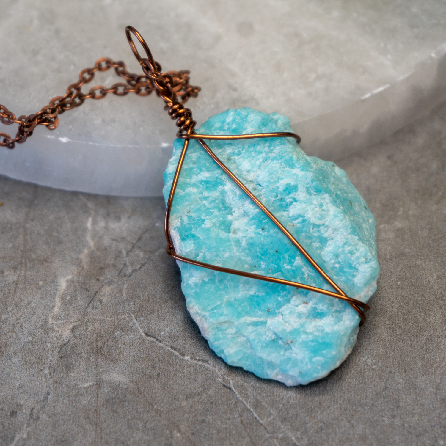 Amazonite is a stone of peace, truth, harmony, and communication. It gently soothes the nerves, and it’s energies can be felt to the touch. This stone radiates blue rays full of rejuvenating vibrations that are here to calm the heart. Any environment that Amazonite is placed in will calm the energy and fill the air with positive energies. It’s been called the “peacemaker stone” due to its communicative abilities. Our heart and throat become linked, thus allowing the truest thoughts to surface and be spoken with ease. Emotions usually play a role when trying to express any truth, making it naturally hard to speak from the heart due to the power of the mind. This crystal provides flowing energies just like the river in which its found. Amazonite encourages adventure, love, inspiration, and free speech. When trying to communicate difficult topics to the ones we love, try placing a piece of Amazonite in your pocket and allow it to start working. Let the stone calm the environment and dispel any negative energies that may be near. Conversations will soon flow and allow nothing but the passionate truth to be vocalized.