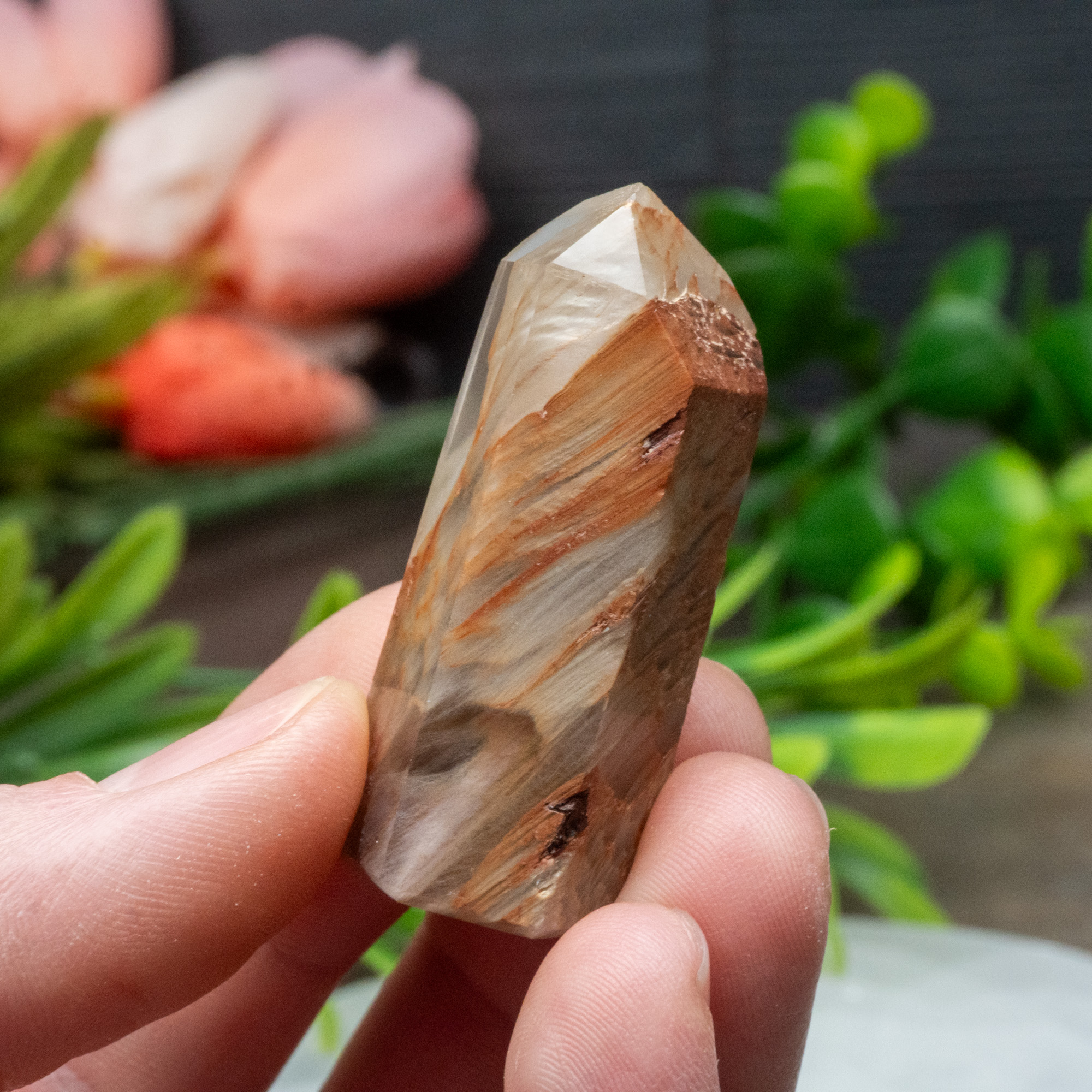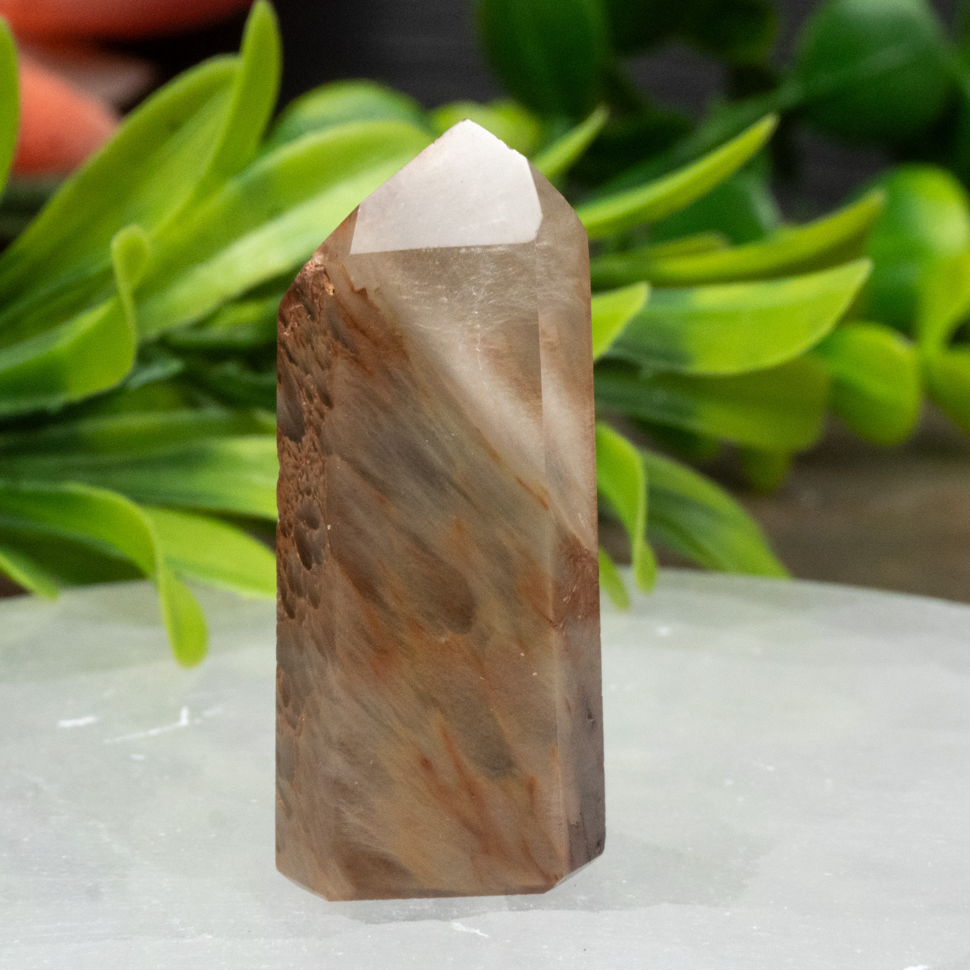 Amphibole is an inclusion that forms within Quartz that can be seen as red, beige, brown, yellow, and green. The energies promote grounding of your energies which is enhanced by the Quartz crystal it has formed in.