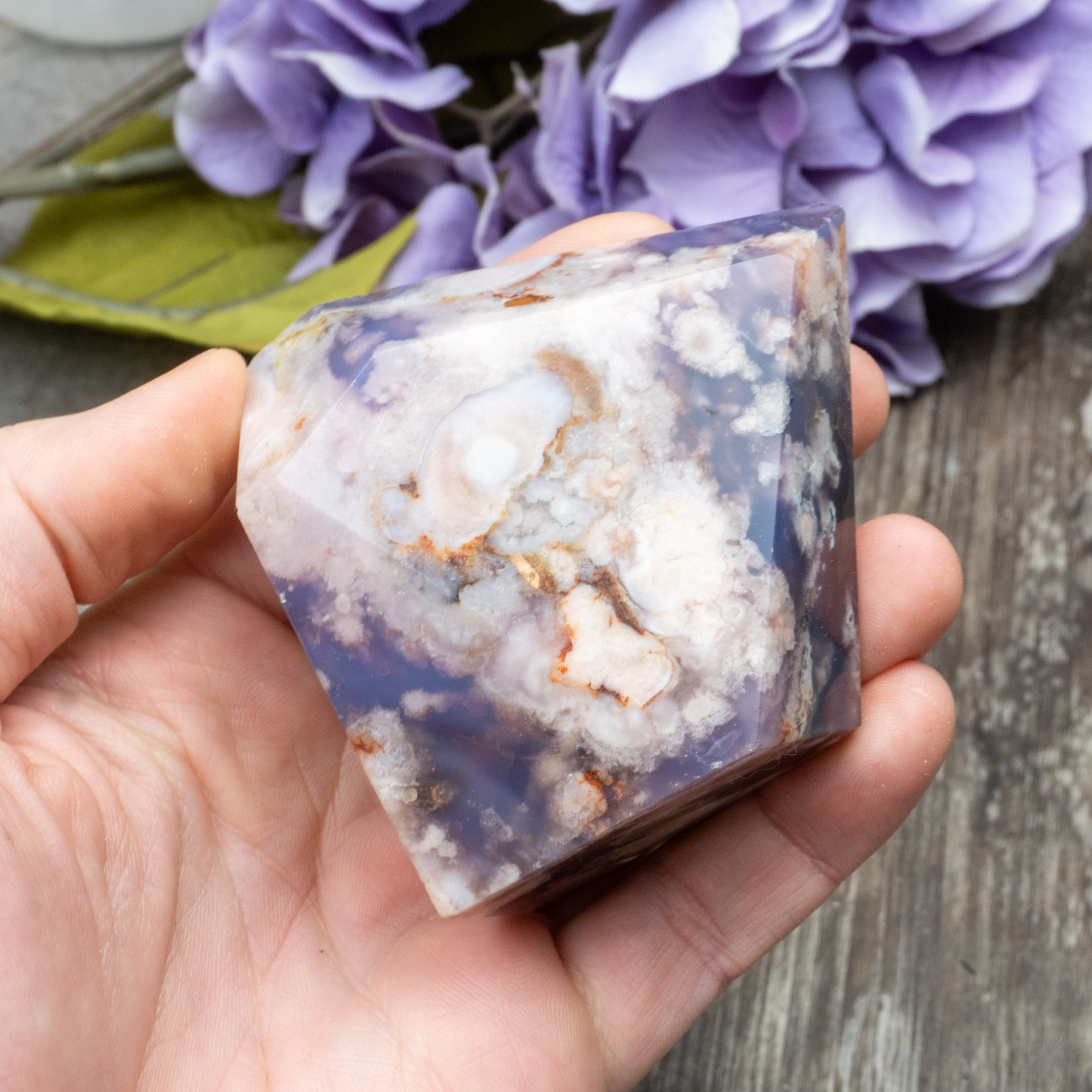 Blue Flower Agate helps one bridge the gap between emotions and reality by activating and connecting our heart and root chakras together. This unique effect can best be felt through deep meditation, with one solely focusing on their emotional body and it’s current needs. By doing this exercise, one will begin to gain freedom from the deep pain that has attached itself to our hearts and will assist us in looking towards the path of self-embetterment. Blue Flower Agate’s energies resonate with one’s core and can help better expose this damaging and sometimes traumatic pain that we still carry. Some of us go about our daily lives not realizing the extra weight that we carry as well as the toll that it takes on our physical and mental health. By releasing the constraints one has unknowingly placed upon themselves, they are able to reignite the everlasting love that all of us can release. This pure, undeniably affectionate energy is a direct result of working with Flower Agate and can benefit the love you have for others, but more importantly, the love you show to yourself.
