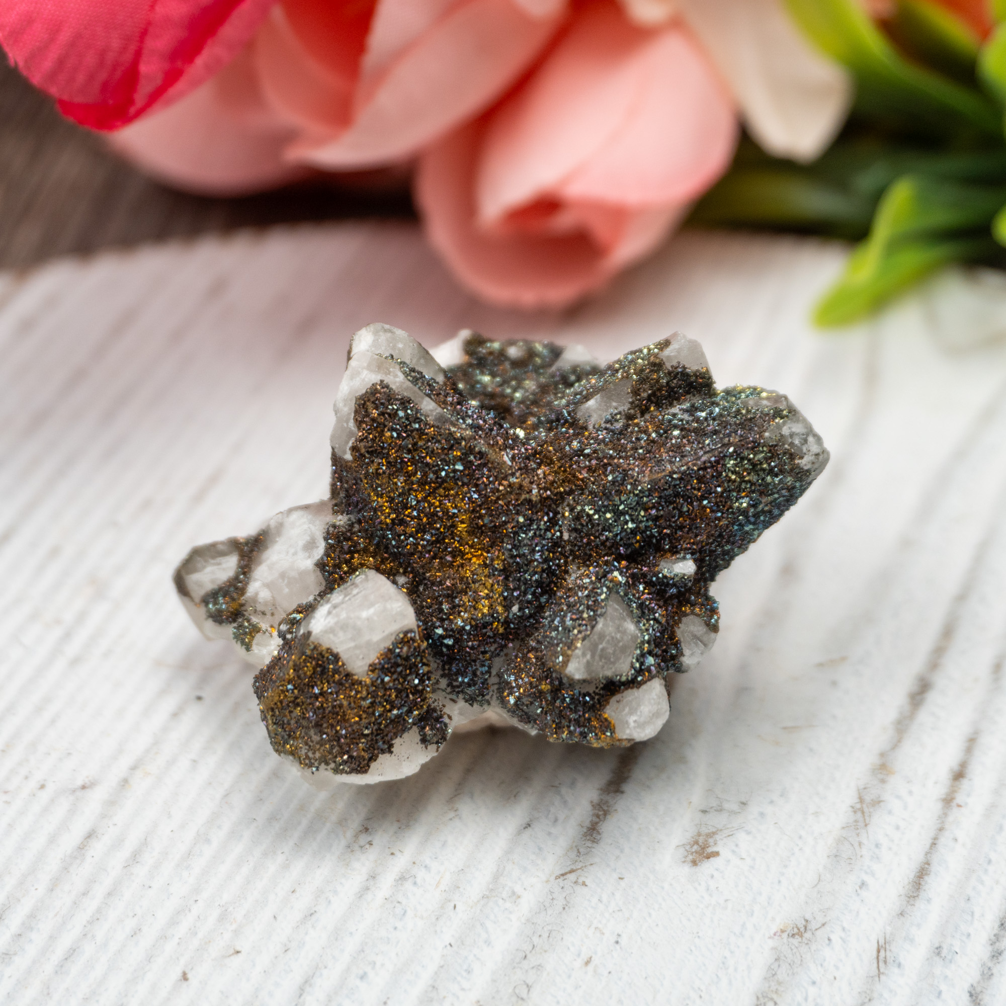 High quality Chalcopyrite on Snow white Calcite! Chalcopyrite is a powerful stone that activates and aligns all chakras. It’s a powerful tool that has been used to remove blockages of chakras by shamans and reiki professionals. This stone offers up transformative energies that assist in changing of habits, routines and lifestyles. Working with this stone will help one in finding their own way and life meaning. Carrying this stone daily is ideal for anyone feeling like their “stuck” in the same daily motions and are looking for a sudden change. This stone has always been associated with opportunity and new beginnings, and has been commonly used as a trinket for obtaining luck. Although this stone actives all chakras, it specifically resonates with the higher 3 chakras. Chalcopyrite has been known to expand the mind and open it up to a higher realm. This stone opens our third eye to endless visions when meditating with it, while also using our crown chakra to bridge the gap between physical and spiritual realms. The energies of this stone on the throat chakra specifically help in bringing in this knowledge to the physical. By being able to talk about what you see, feel and hear, you are making it a physical emotion, confirming its reality. That energy can manifest and bring with it positive and life changing opportunities.