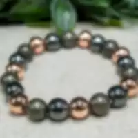 This Copper, Pyrite, and Hematite bracelet combines the warm metallic glow of copper, the golden shimmer of pyrite, and the sleek gunmetal sheen of hematite in polished 10mm beads. Together, these stones create a powerful synergy—copper amplifies energy flow, pyrite attracts prosperity and confidence, and hematite grounds and protects your aura. This striking bracelet balances style with strong, purposeful energy.