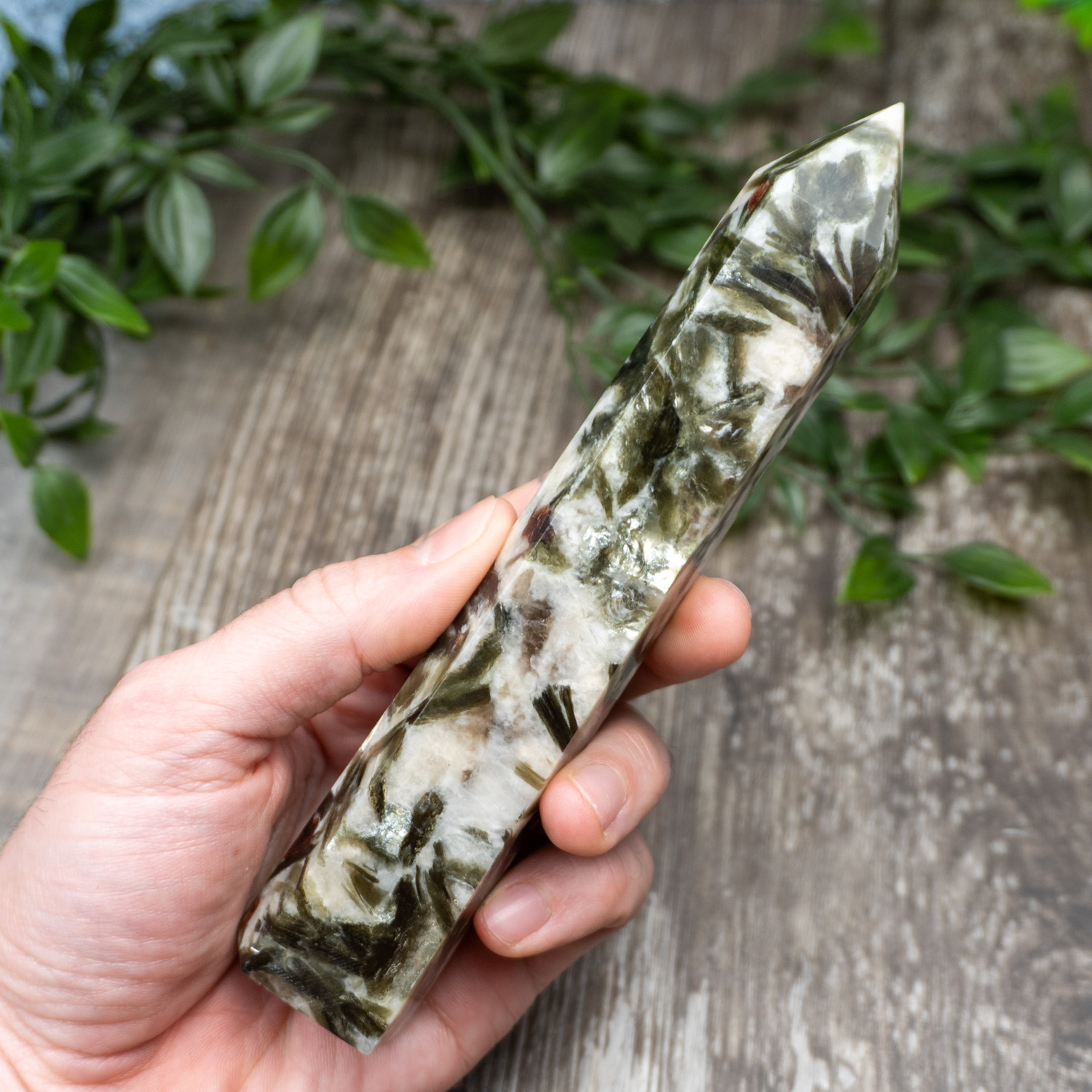 Green Mica in Quartz combines reflective mica inclusions with the amplifying clarity of quartz, creating a balanced presence that supports awareness and steady emotional grounding. The green mica encourages renewal, patience, and a deeper connection to the heart’s perspective, while the surrounding quartz strengthens focus and intention. This pairing helps bring clarity to complex thoughts and emotions, making it easier to move forward with confidence and understanding. Working with Green Mica in Quartz supports calm insight and encourages thoughtful, steady personal growth.