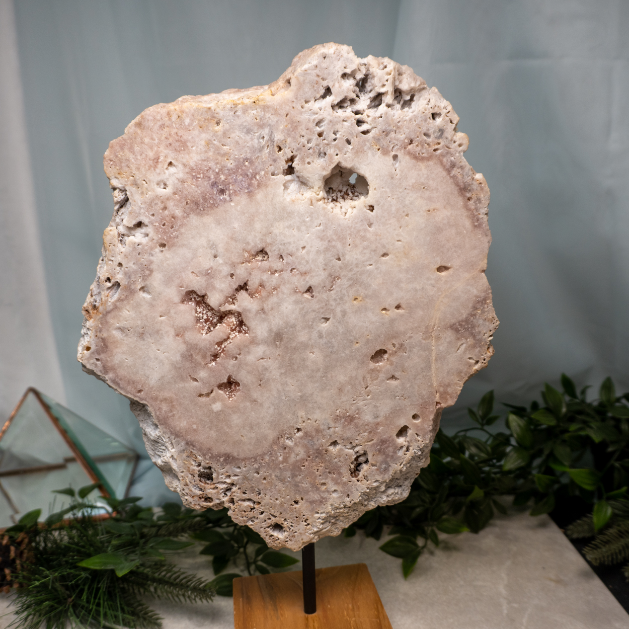 Pink Amethyst is a special variety of Amethyst with druzy inclusions often. This piece comes mounted on a stand that swivels! Amethyst is a stone of protection and opening up the third-eye.