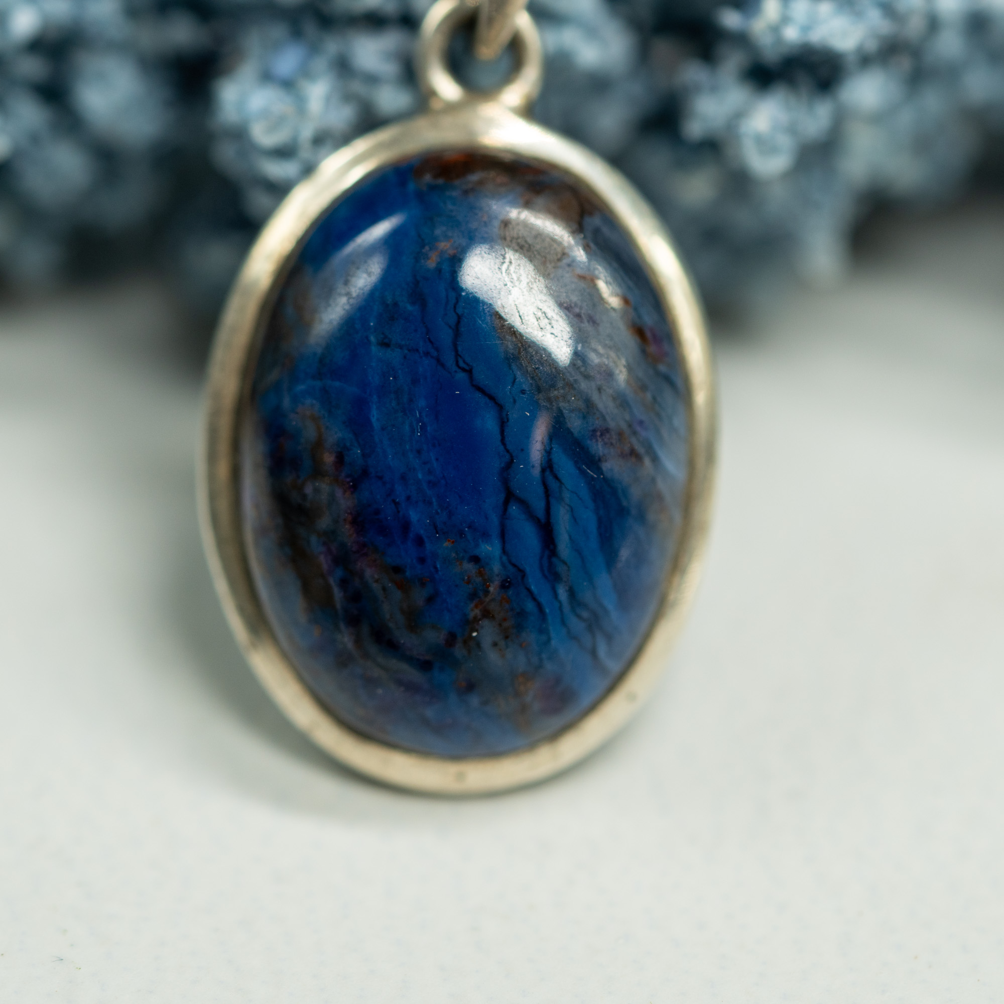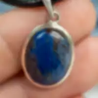 Encased in a classic silver setting, this Richterite pendant boasts an alluring deep blue color with wisps of white, embodying the dynamic beauty of a stormy night sky. Richterite is cherished in metaphysical communities for its calming properties, believed to soothe the nerves and release tension. This pendant is not only a stunning accessory but also serves as a talisman for tranquility, inviting serenity and supporting clear communication for the wearer.