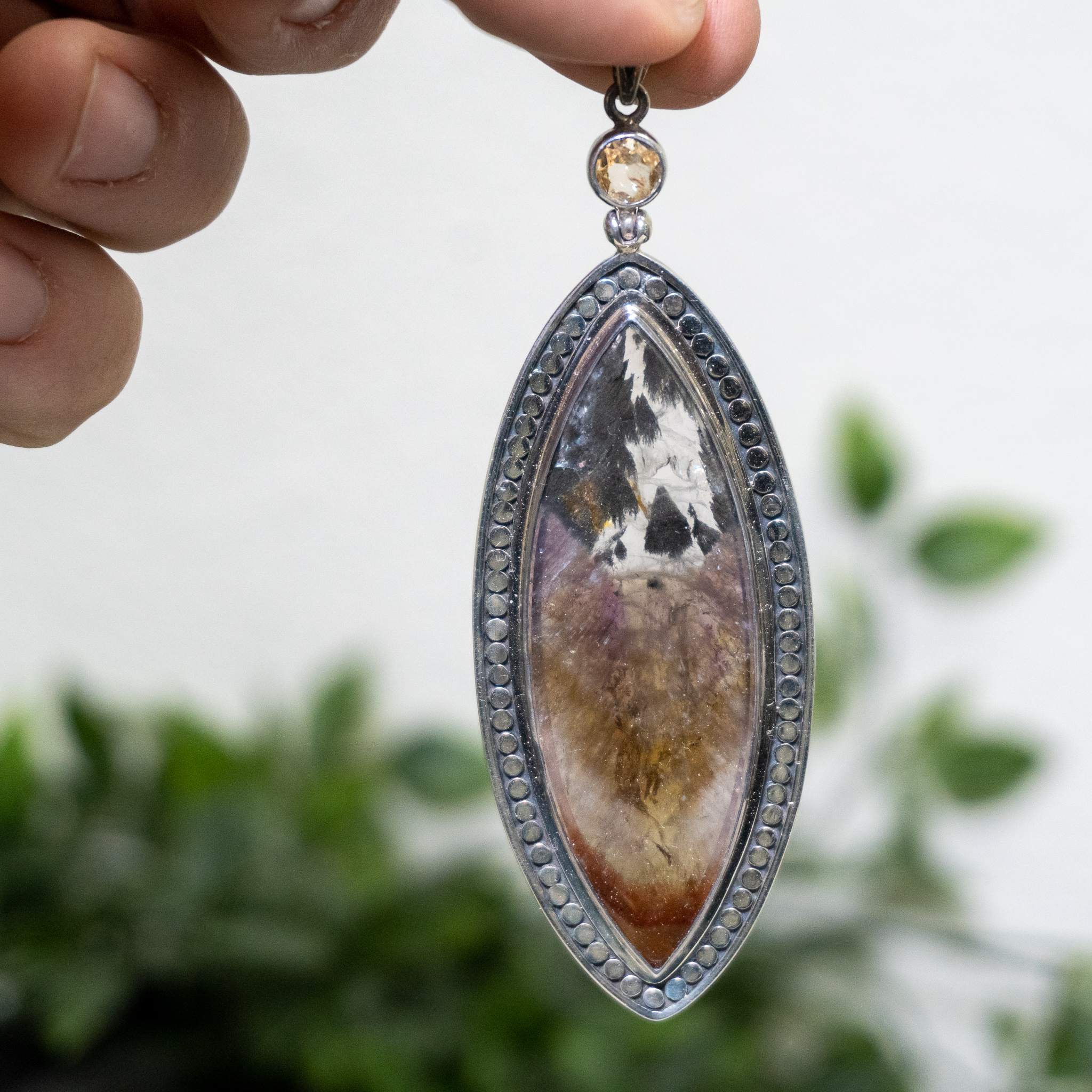 These hand polished cabachon was set in a cusom silver frame to accent its shape. This unique pieces comes with a Heliodor gem ontop of the necklace. Super Seven, also known as Melody Stone or Sacred Stone, is an extremely rare mineral with seven crystals in one. The crystals are Amethyst, Cacoxenite, Goethite, Lepidocrocite, Rutile, Smoky Quartz, and Quartz. Super Seven is the key ingredient to accessing the spirit realm and unlocking the knowledge and ancient beings within. The high frequency of this stone helps one attune their energy to that of celestial beings, allowing one to better understand the meaning and purpose of their soul.
